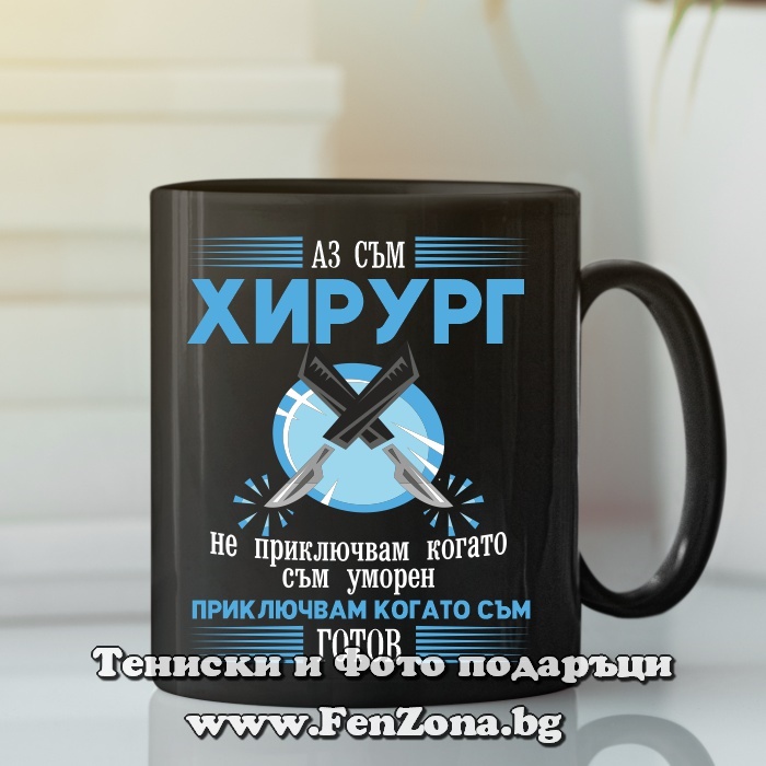 Черна чаша с надпис Аз съм хирург, не приключвам когато съм уморен, приключвам когато съм готов