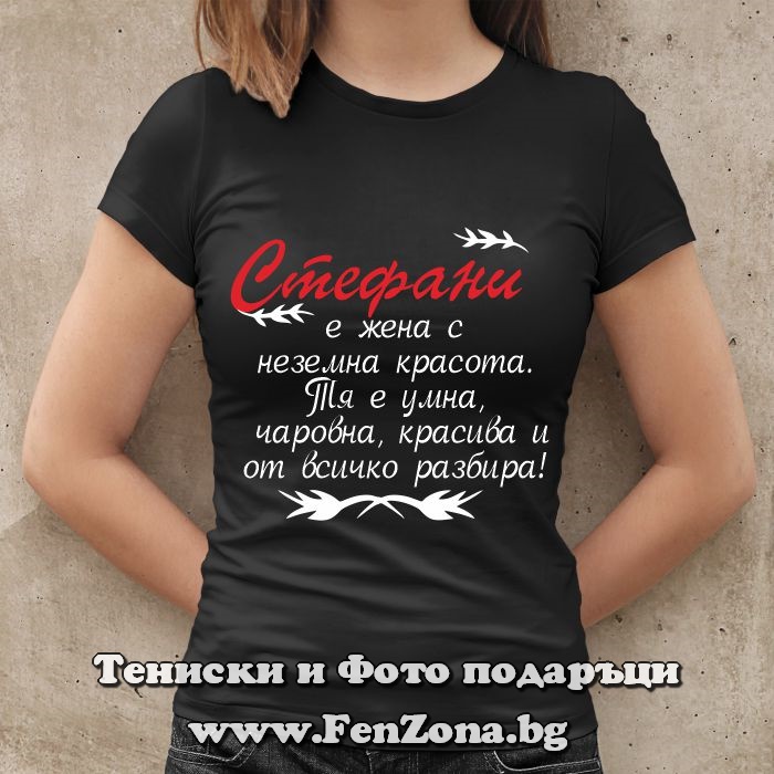 Дамска тениска за имен ден – подарък с надпис Стефани е красива и от всичко разбира