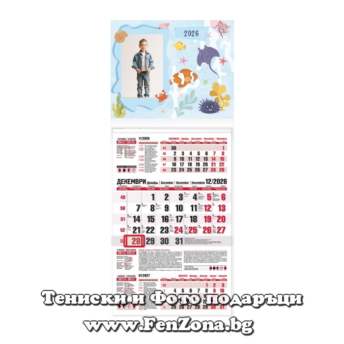 - Трисекционните календари със снимка са с размер 73 см височина и 30 см широчина. Предлагат се само на червена основа