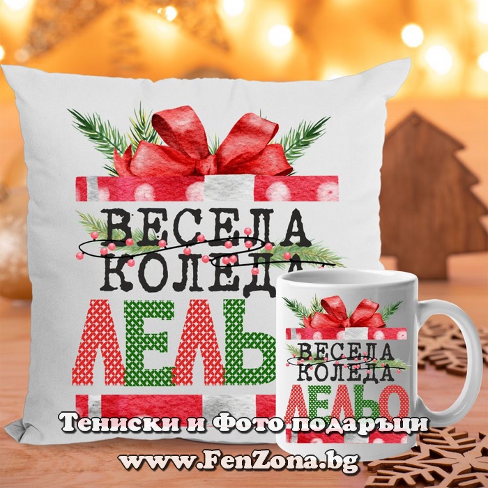 Комплект Възглавница и чаша подарък за коледа за леля с надпис Весела Коледа лельо – подарък