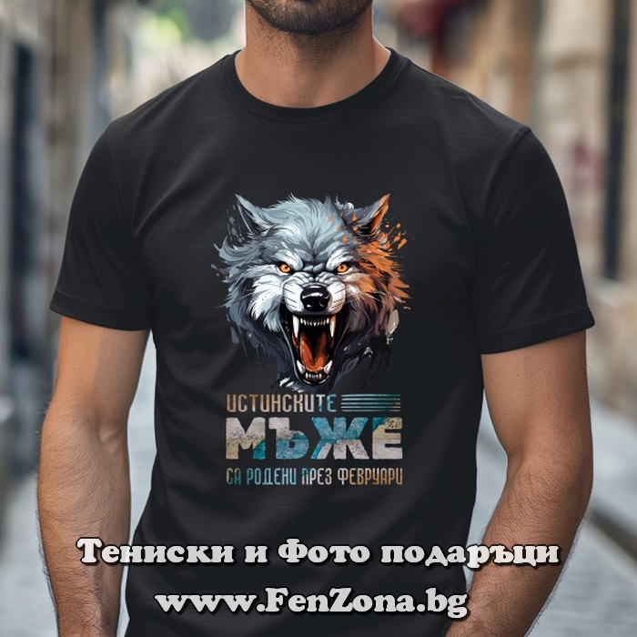 Мъжка тениска с надпис Истинските мъже са родени през Февруари – вълк